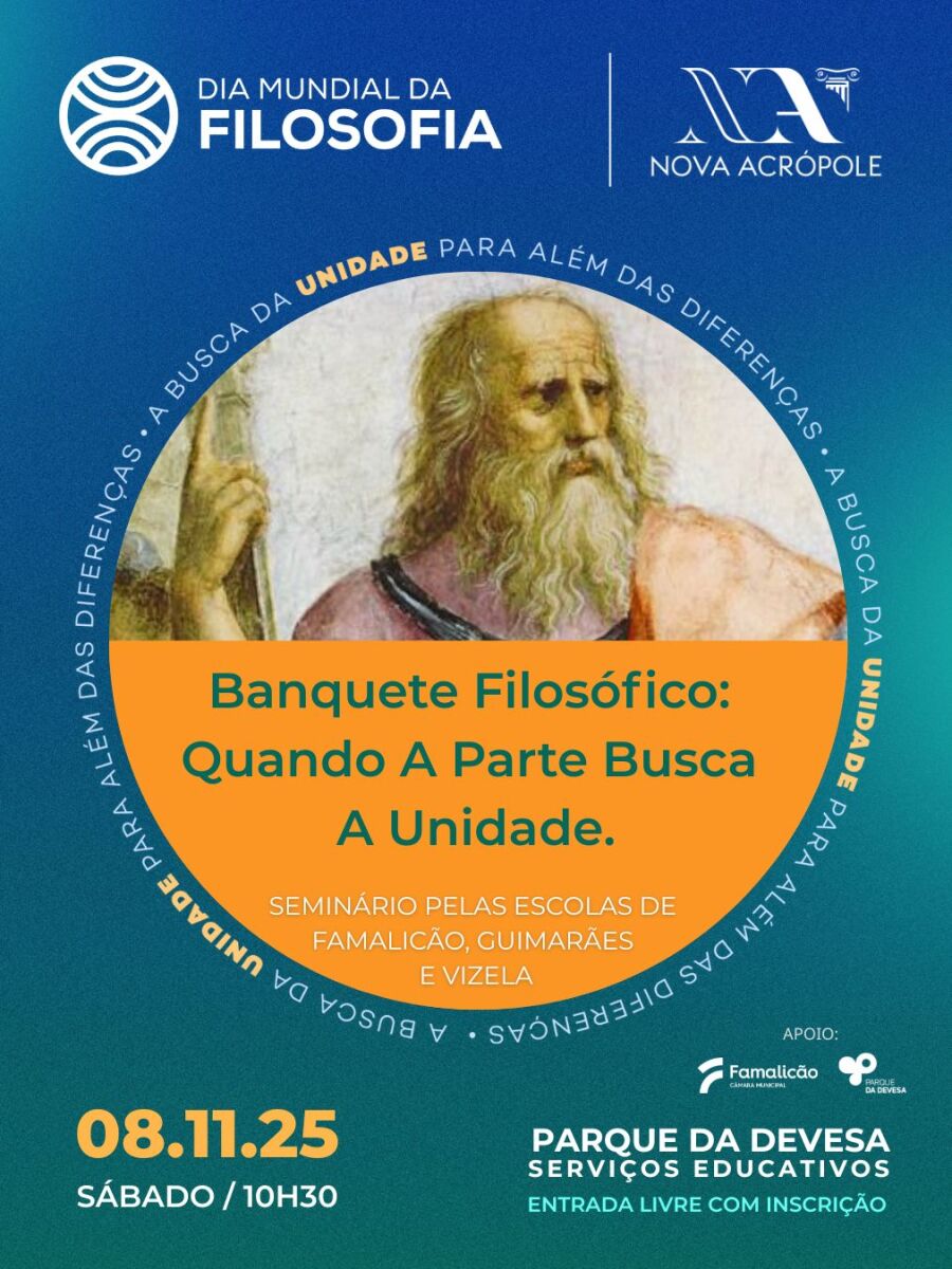 Banquete Filosófico: Quando A Parte Busca A Unidade. Este será o tema dedicado ao Dia Mundial da Filosofia, dedicado a uma das obras mais belas de Platão, “O Banquete”. Este diálogo é dedicado a Eros, centrando-se no tema do Amor, levando-nos à construção do caminho interior do ser humano e na sua busca constante da alma gémea, da parte que nos complementa e que nos permite viver na plenitude, na unidade. Nesta tertúlia faremos também a comparação da filosofia do Amor de Platão com a visão de Sri Ram e Khalil Gibran.