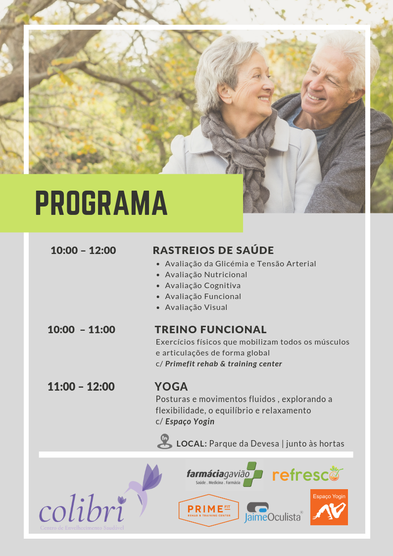 10h00 às 12h00 Rastreios de Saúde10h00 às 11h00 Treino Funcional11h00 às 12h00 - Yoga